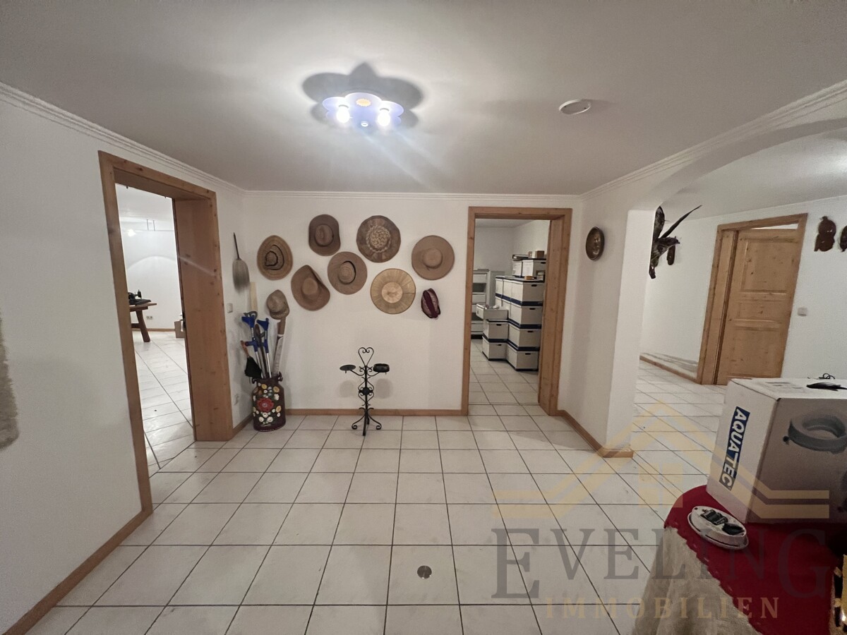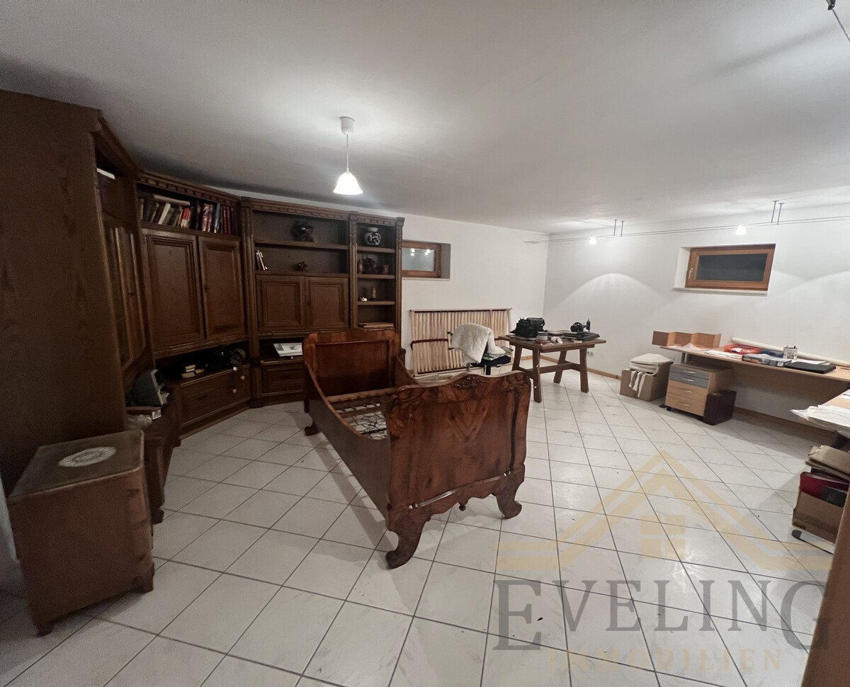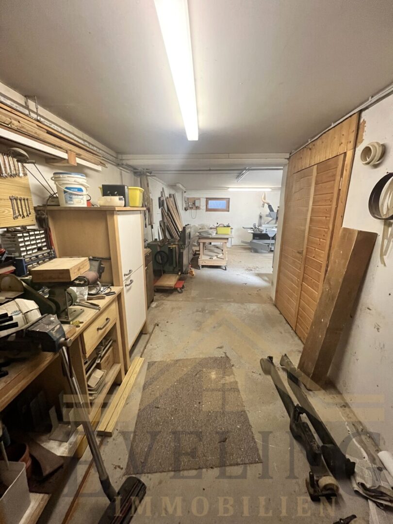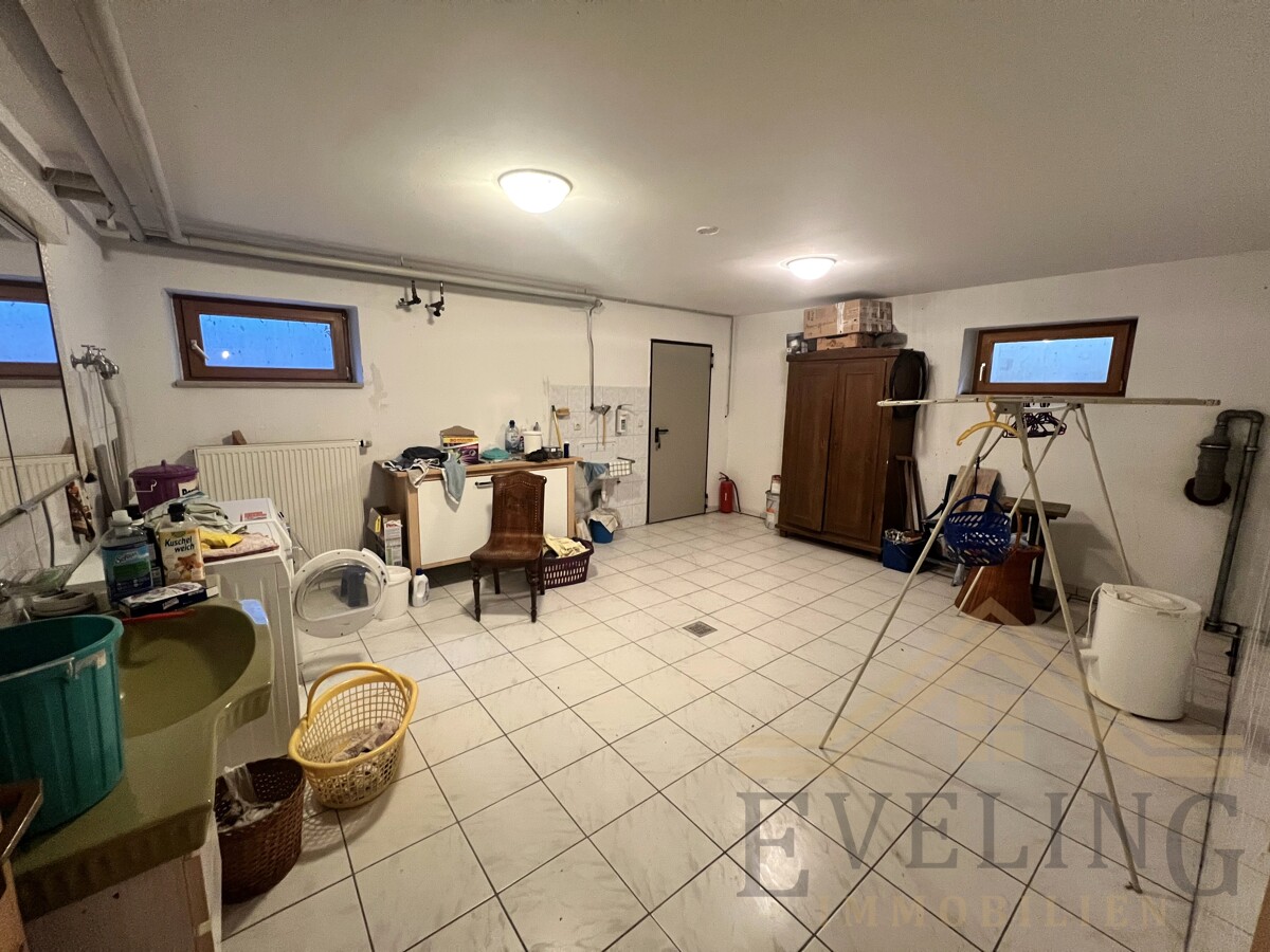 Das Untergeschoss mit Fliesenboden bietet neben der großen Waschküche und geräumigen Kellerräumen eine Werkstatt mit einem Außen- und Innenzugang.