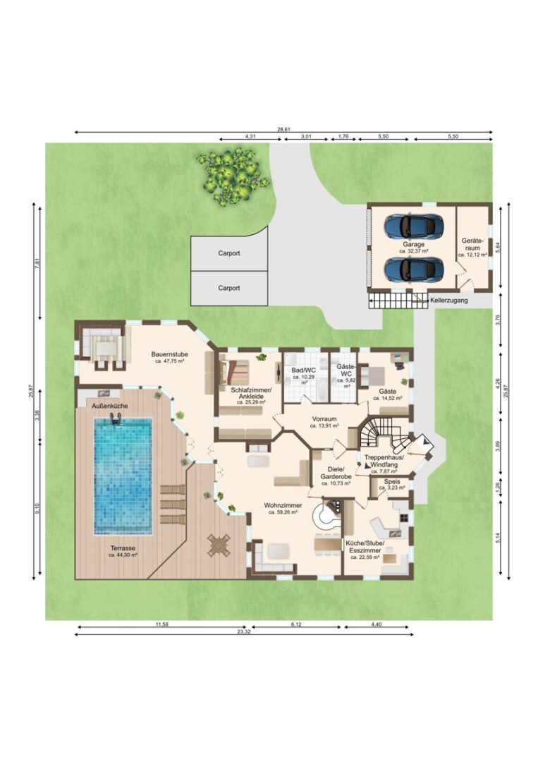 Im Außenbereich überzeugen ein Pool mit aufschiebbaren Dach, eine Outdoor-Küche, eine Doppelgarage mit angrenzendem Geräteraum sowie ein Carport mit zwei Stellplätzen.