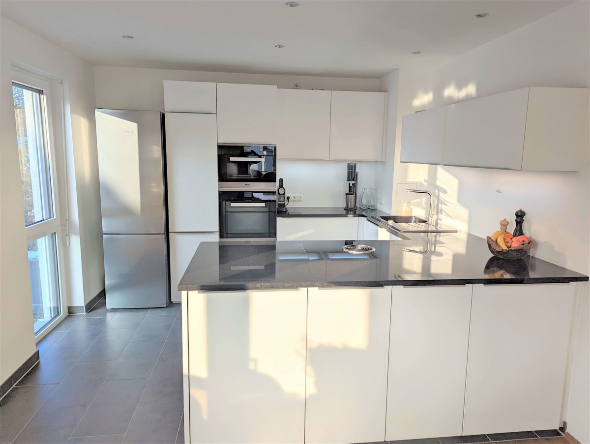 Der offene Küchenbereich ist durch das bodentiefe Fenster ebenfalls schön lichtdurchflutet und die große Kochinsel lässt keine Wünsche offen!